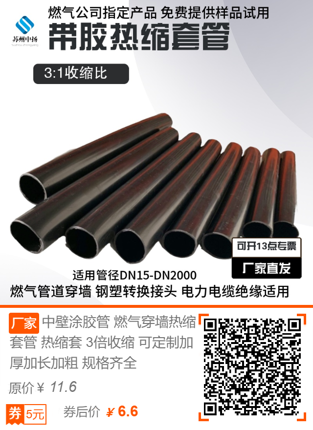 還有一種是天然氣管道穿墻入戶使用的穿墻保護熱縮套管,這種一般寬度在1米一根,可以根據要求裁斷。厚度在1.1mm左右,也有一種加厚的,在2.0mm左右。所有規格都可以根據客戶要求定制。